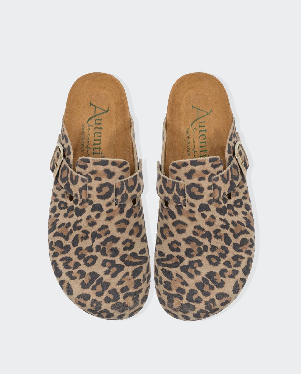 Modelo Autenti zueco. Fabricado a mano en animal print leorpardo en piel serraje con hebilla lateral ajustable. El serraje tintado es un tipo de piel natural que puede sufrir pequeñas variaciones en el estampado y en el tono.