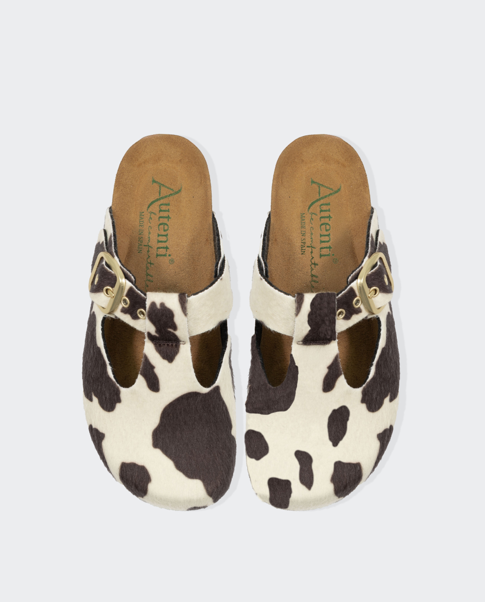 Modelo Autenti bio zueco. Fabricado a mano en animal print vaca (vegano) con hebilla mate lateral ajustable y ojales al tono. Disponible en un color.