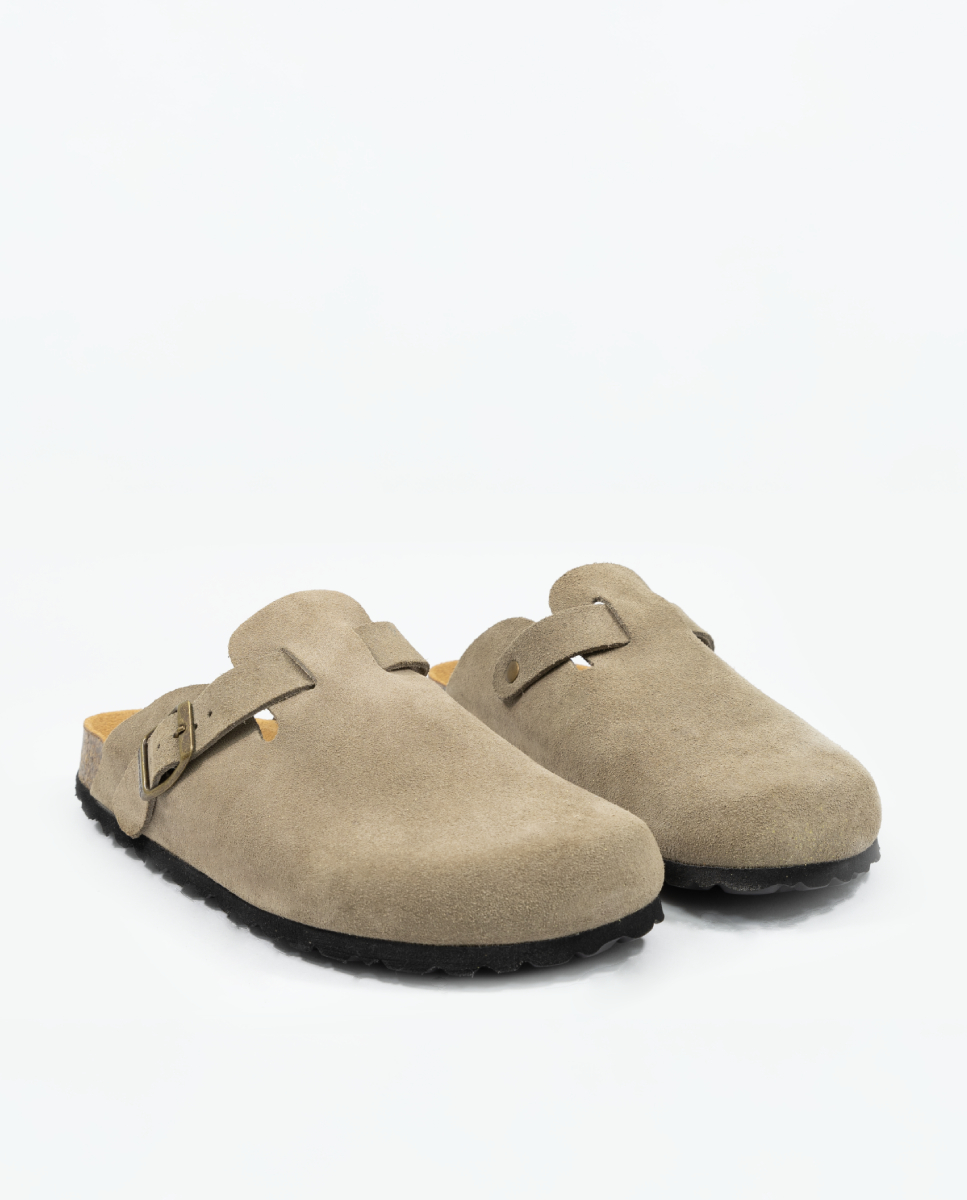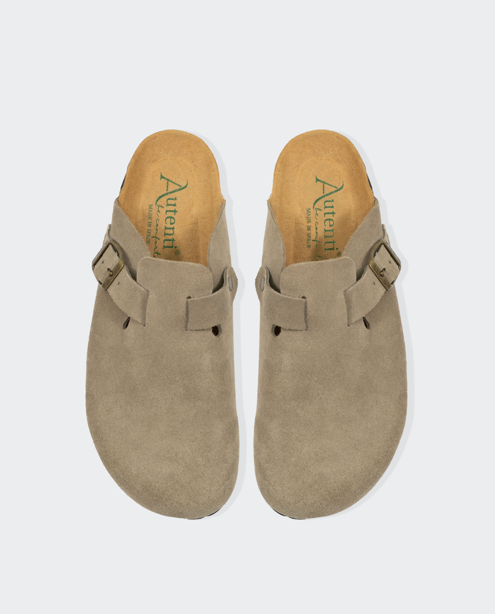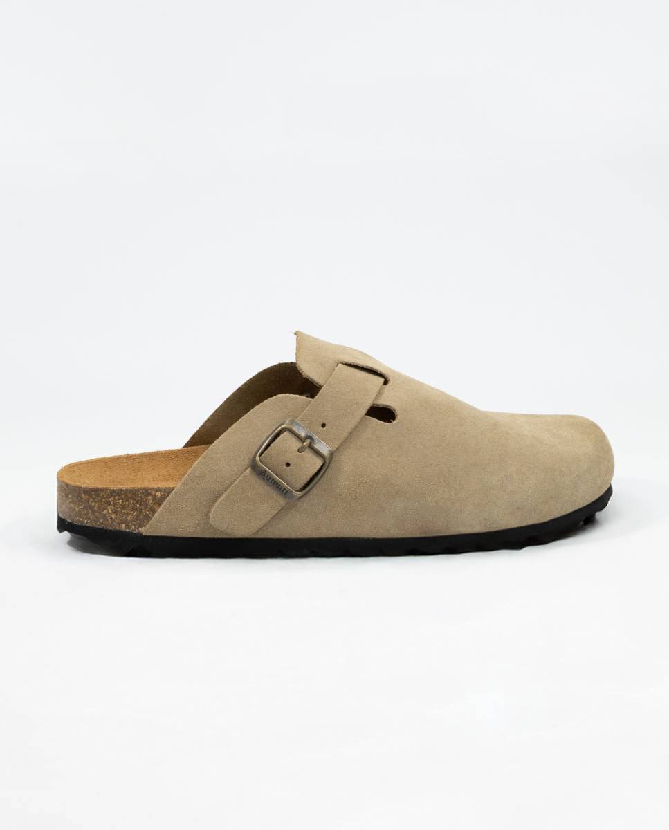 Modelo Autenti bio en zueco. Fabricado a mano en piel serraje con hebilla lateral ajustable disponible en cuatro colores. El serraje es un tipo de piel natural que puede sufrir pequeñas variaciones en el tono.