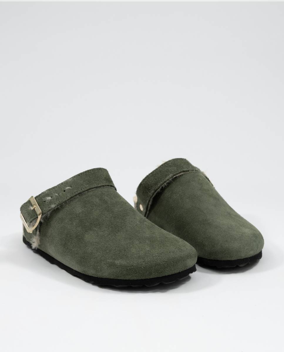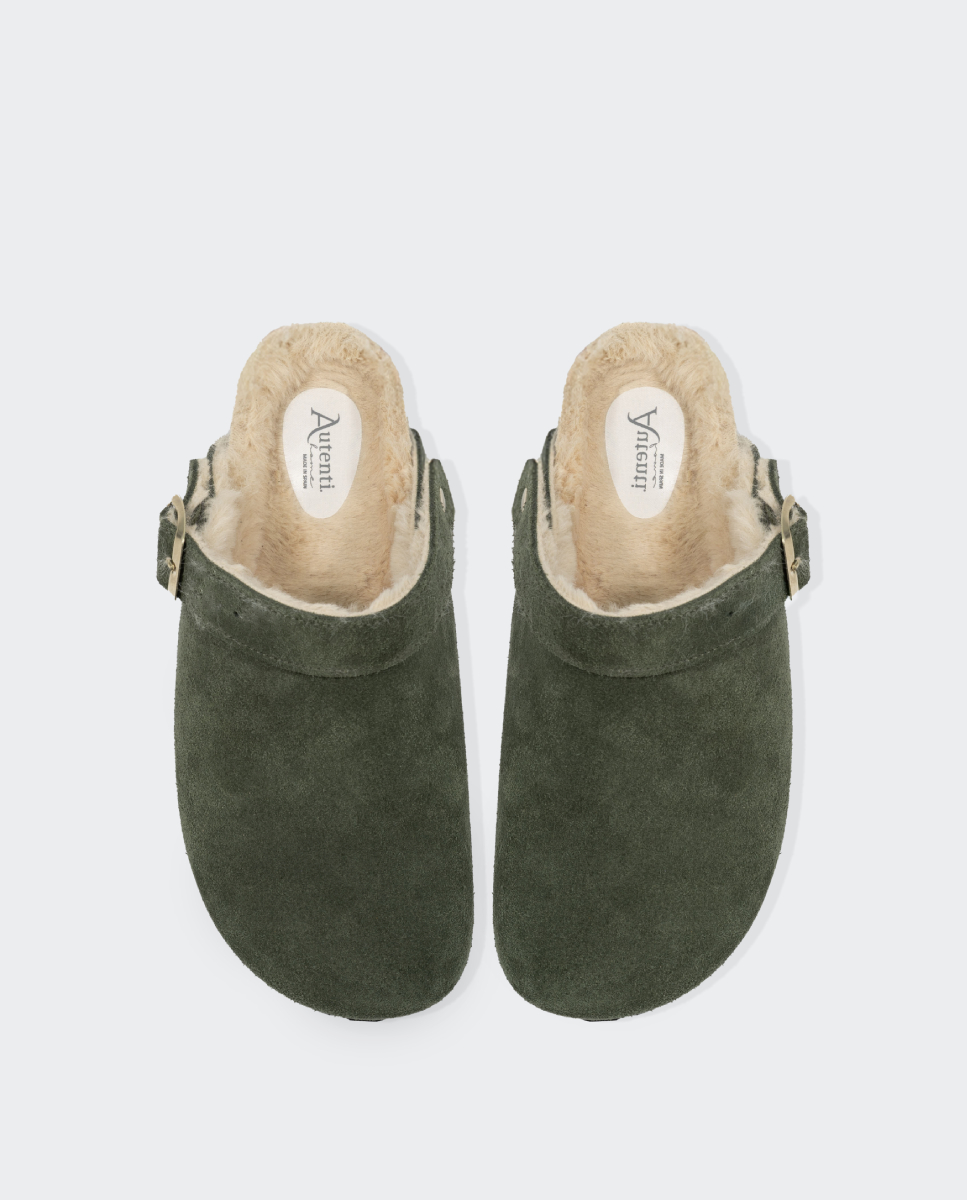 Modelo Autenti bio en zueco. Fabricado a mano en piel serraje con hebilla lateral ajustable en una tira abatible que podrás utilizar tanto por delante como por detrás para un mejor ajuste, con pelo (vegano) en toda la parte interior del zueco, disponible en tres colores.
