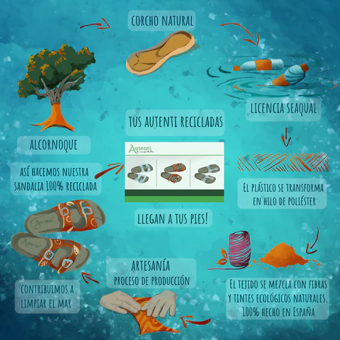 Gracias a nuestra Licencia con SEAQUAL, empresa que trabaja en la producción de tejido reciclado de plásticos recogidos del mar, desde Autenti Shoes estamos cualificados para poder fabricar sandalias bio 100% recicladas.